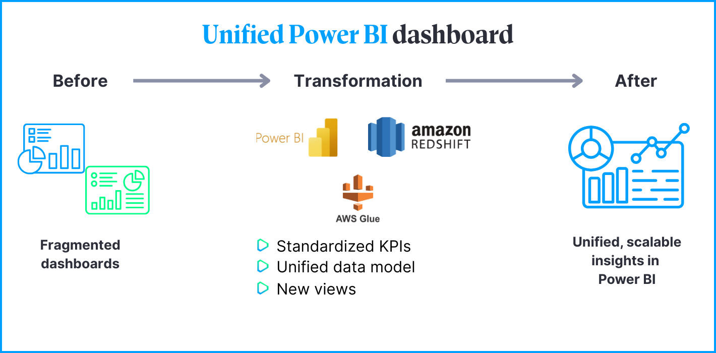 The project focused on transforming fragmented reporting into a single, future-ready analytics platform. Our goal was twofold: to consolidate existing fragmented reports into a unified, standardized dashboard and to enhance them with new capabilities driven by evolving business needs. Our approach balanced careful clean-up with forward-looking improvements. As a result, we ensured that the solution not only addresses immediate issues but also creates a scalable foundation for future growth.